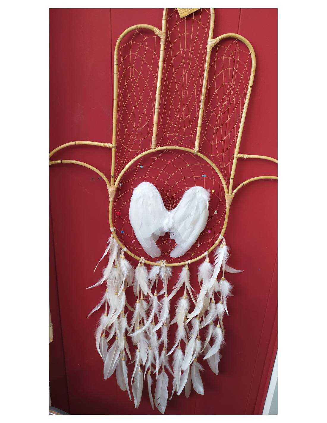 Lo que realmente hace destacar al Atrapasueños Mano de Hamsa sobre los elementos decorativos industriales convencionales es su profunda carga espiritual y su arquitectura visual única. El símbolo del Hamsa rítmicamente representa la protección contra el mal de ojo y la atracción de la buena fortuna, mientras que la red del atrapasueños se encarga rítmicamente de filtrar los pensamientos negativos durante la noche. En este 2026, la tendencia del "interiorismo consciente" nos recuerda que los objetos deben tener una presencia que trascienda lo funcional; y esta pieza es el ejemplo perfecto de cómo el hilo, las plumas y el metal se fusionan rítmicamente para crear un amuleto que parece danzar con el aire, aportando una atmósfera de paz absoluta y belleza atemporal a tu entorno.