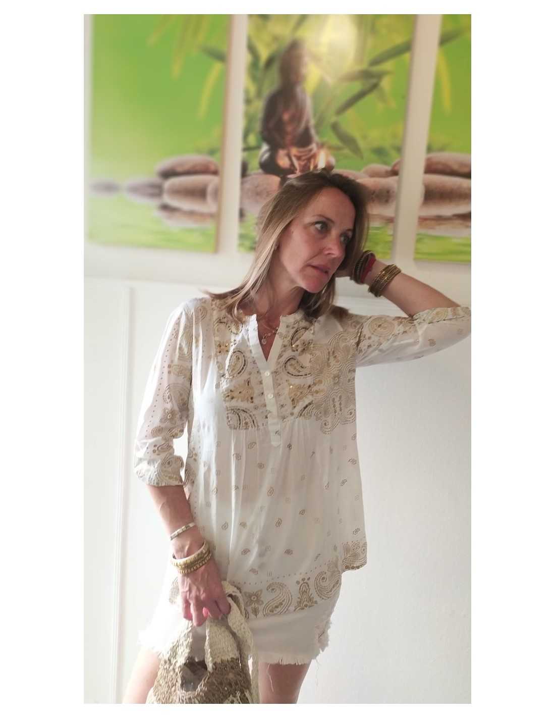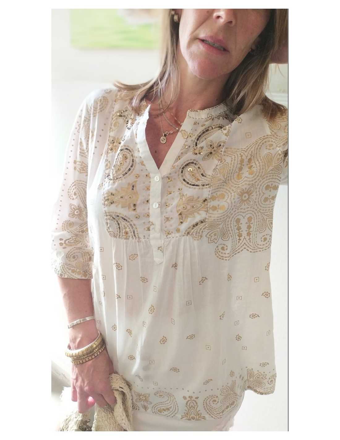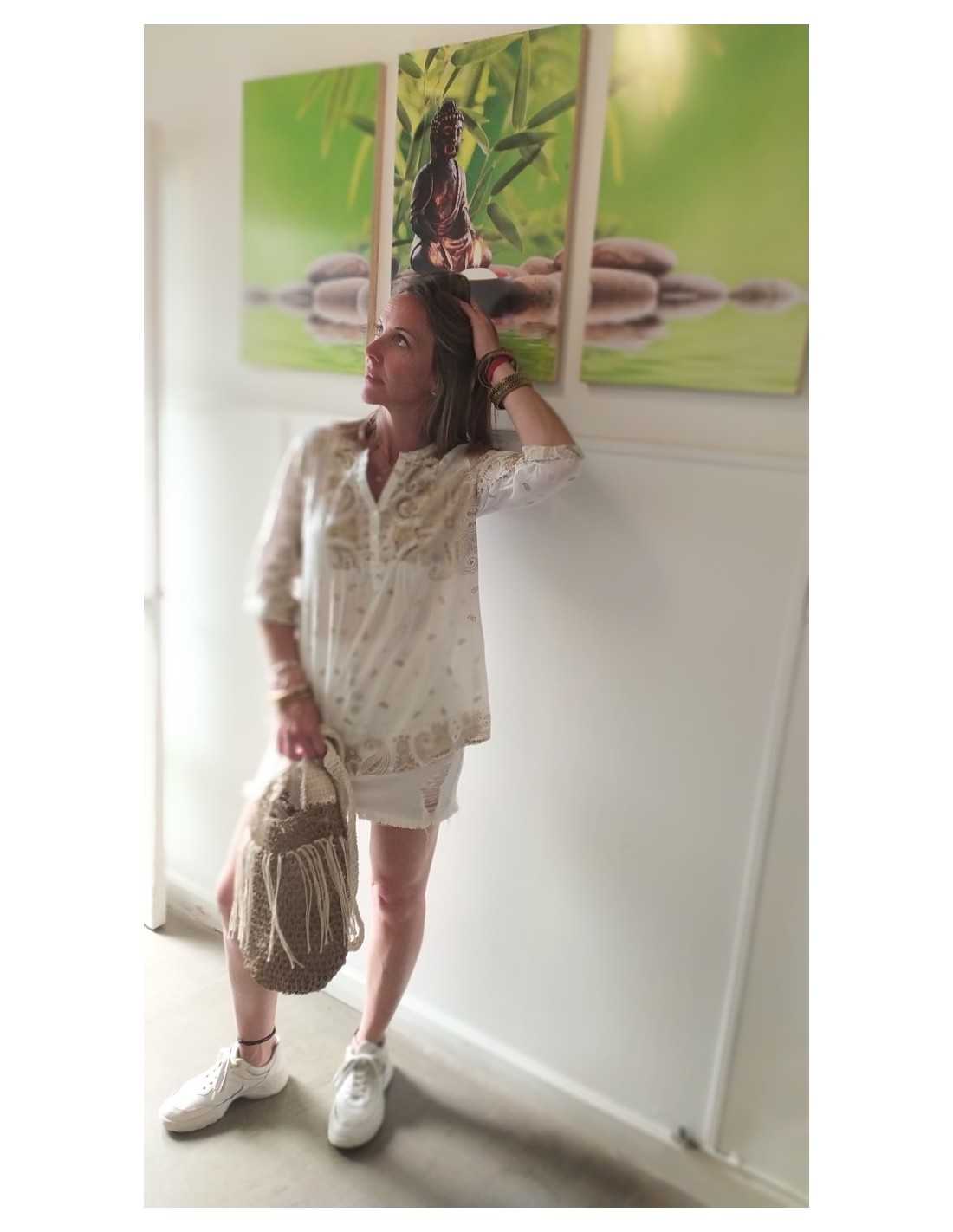 Lo que realmente hace destacar a la Camisola Arabezcos sobre otras blusas de estilo étnico es la armonía de sus patrones visuales. El diseño de arabescos evoca la riqueza de la ornamentación clásica oriental, reinterpretada para la mujer contemporánea que valora los detalles artesanales. La paleta de colores ha sido elegida para iluminar el rostro y combinar fácilmente con diferentes tonalidades de piel. Cada trazo en el estampado ha sido pensado para crear una simetría visual que estiliza la figura, mientras que el corte amplio de la prenda asegura que la comodidad sea la prioridad absoluta en tus jornadas más activas de este verano.