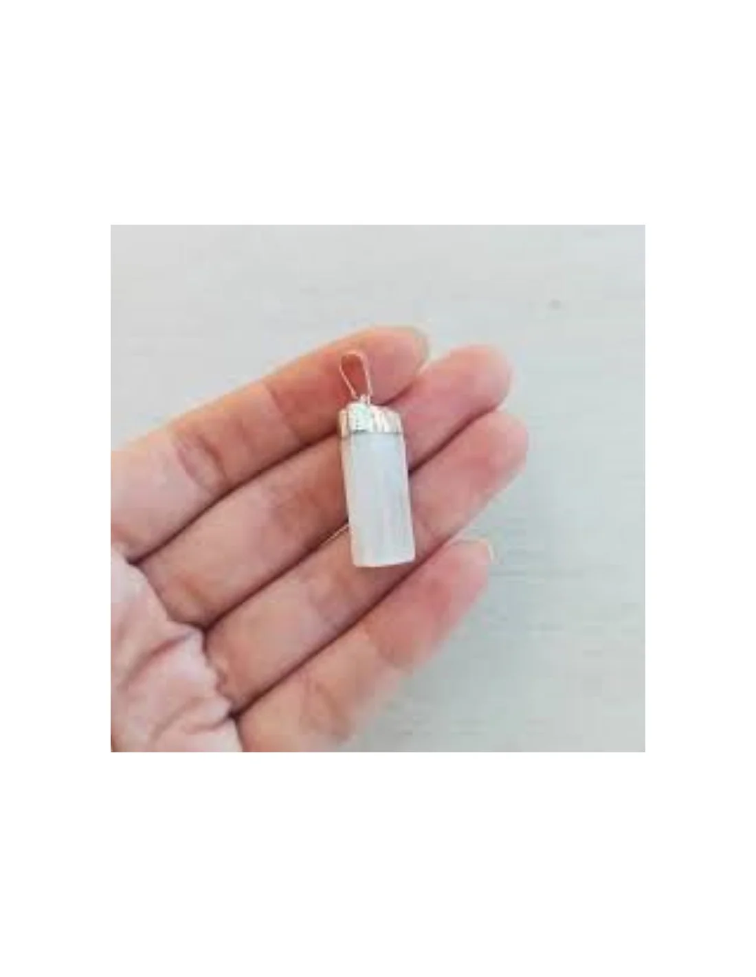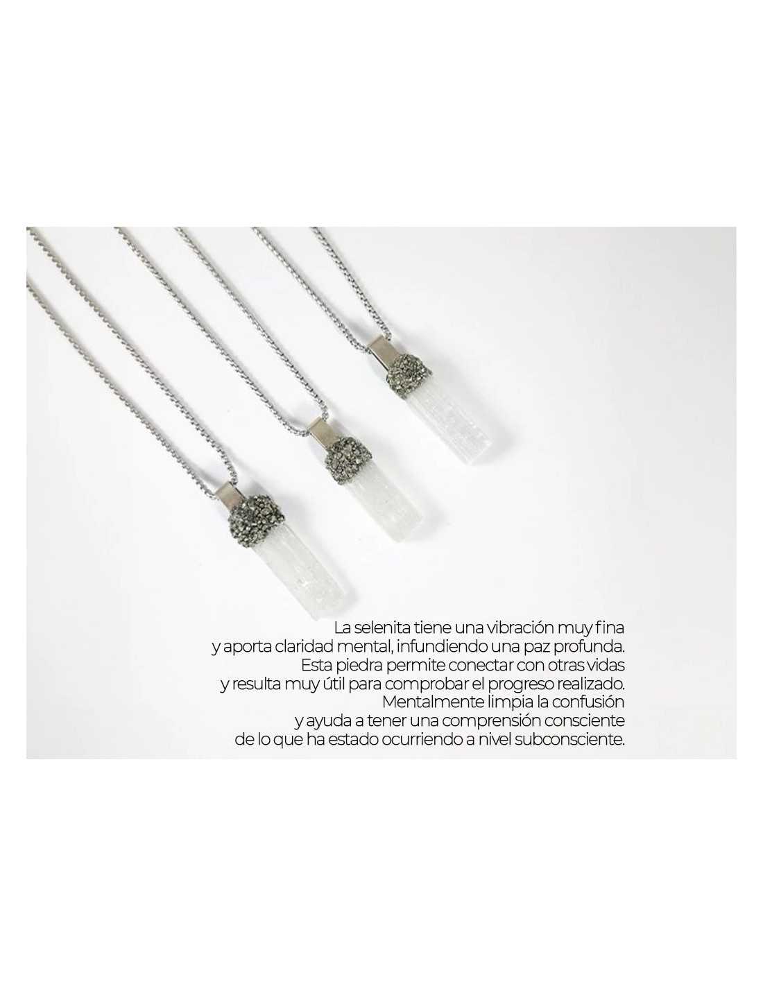 Cada Dije Selenita que encontrás en nuestra tienda es una pieza única, ya que trabajamos con piedras naturales que conservan sus formaciones originales. La selenita se caracteriza por su brillo satinado y sus estrías naturales, que le dan una apariencia casi lunar. Al ser un cristal translúcido, refleja la luz de una manera suave y elegante, lo que lo convierte en el complemento ideal para cualquier estilo, desde un look casual hasta uno más formal. La montura del dije está diseñada para respetar la integridad de la piedra, permitiendo que su energía fluya libremente y esté en contacto directo con tu campo energético.