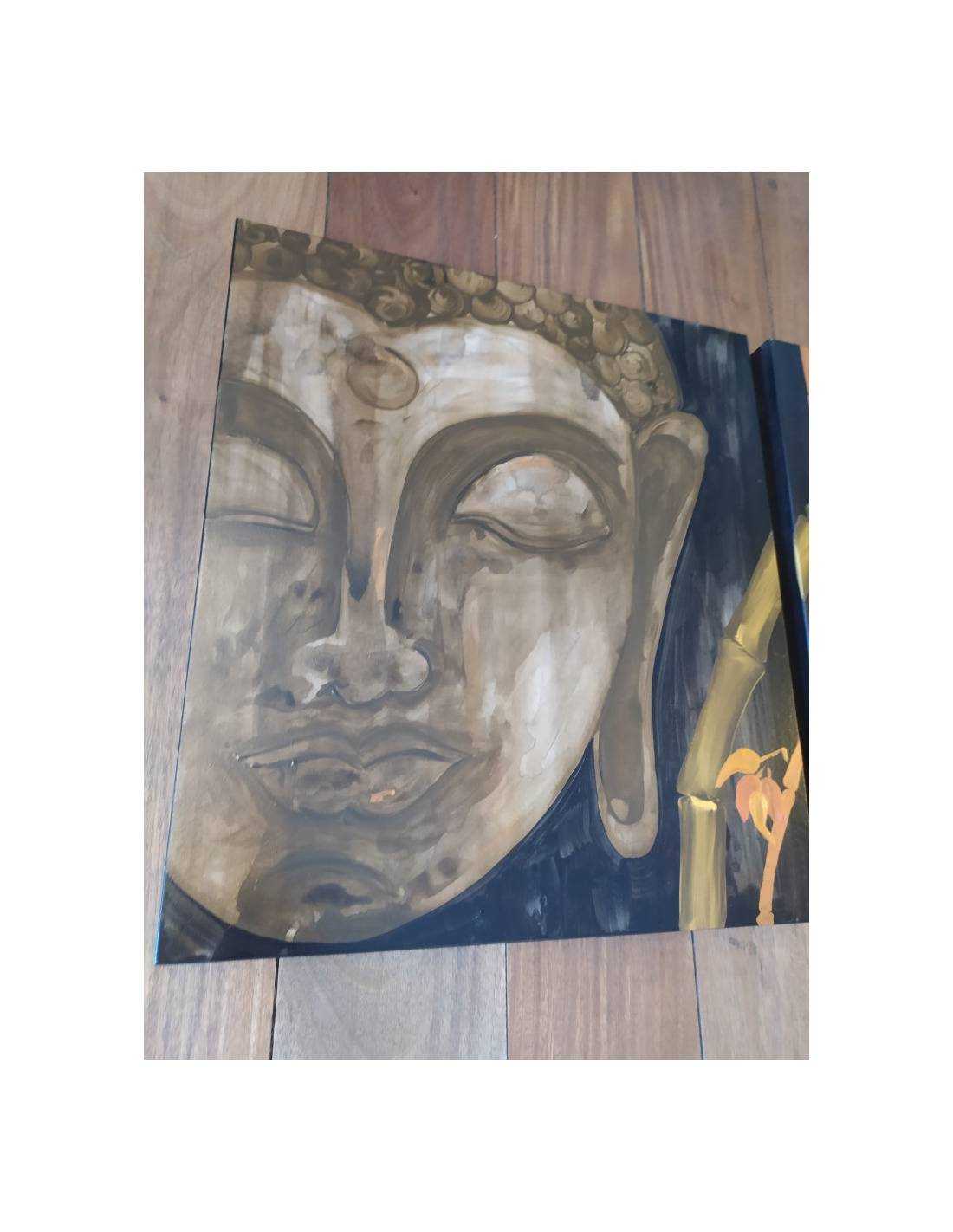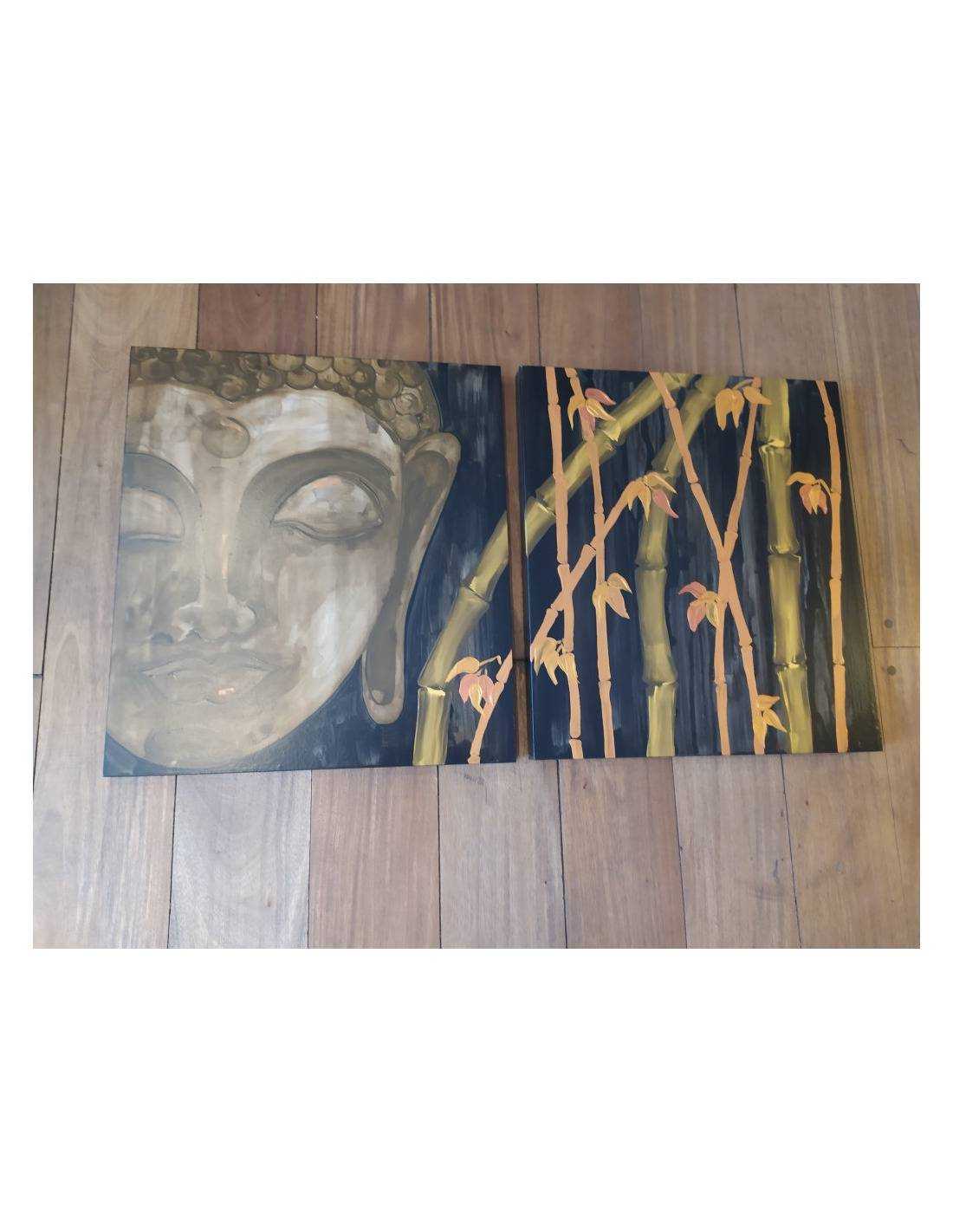 Este elegante cuadro díptico presenta una imagen serena de Buda, pintado a mano con detalles delicados y tonos cálidos que inspiran paz y equilibrio. Ideal para decorar espacios de meditación, salas de yoga o cualquier ambiente que busque transmitir calma y espiritualidad. Dos paneles que juntos forman una obra única y armoniosa.