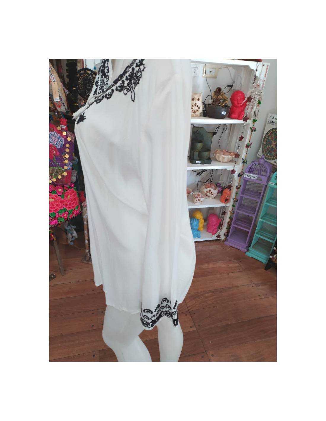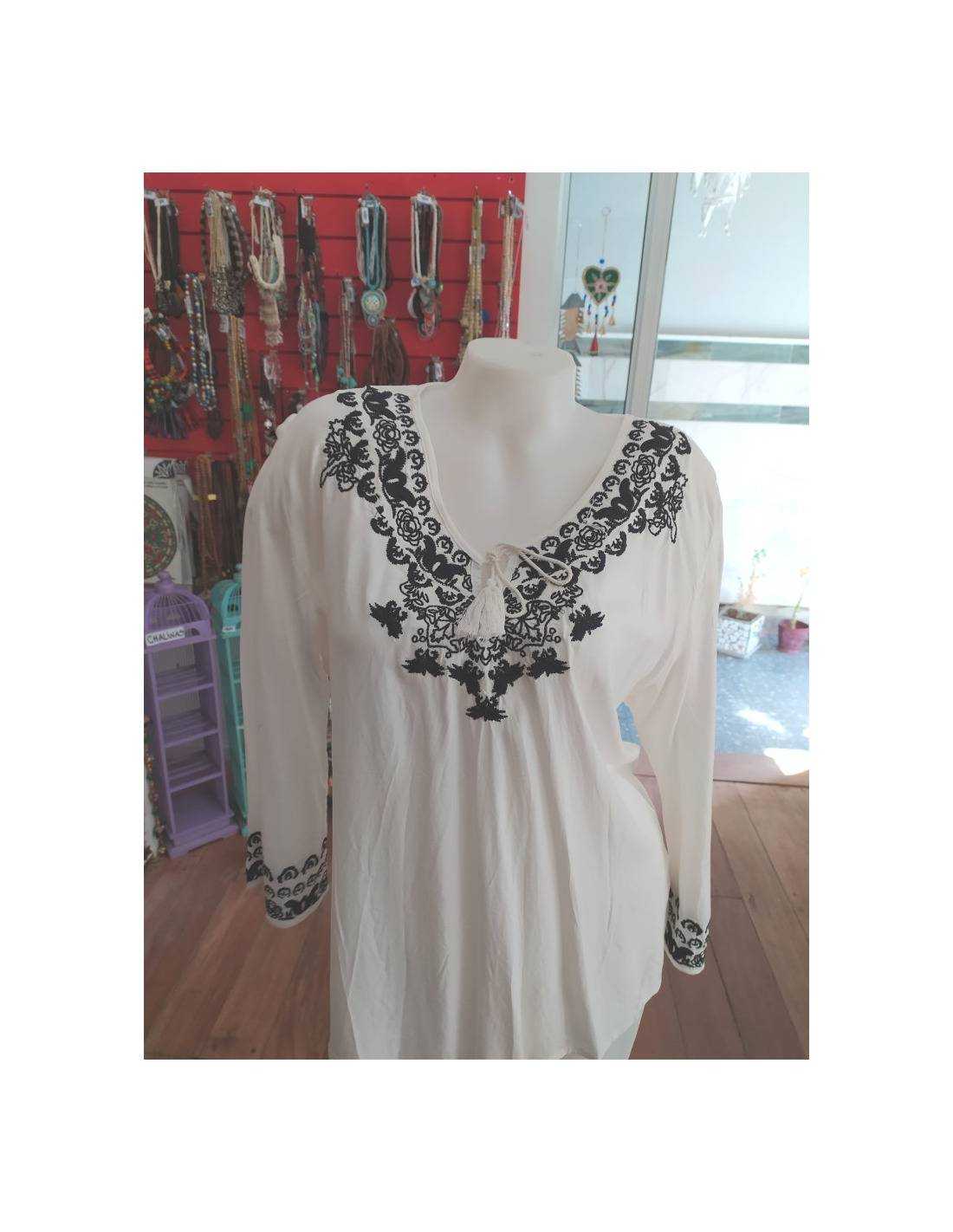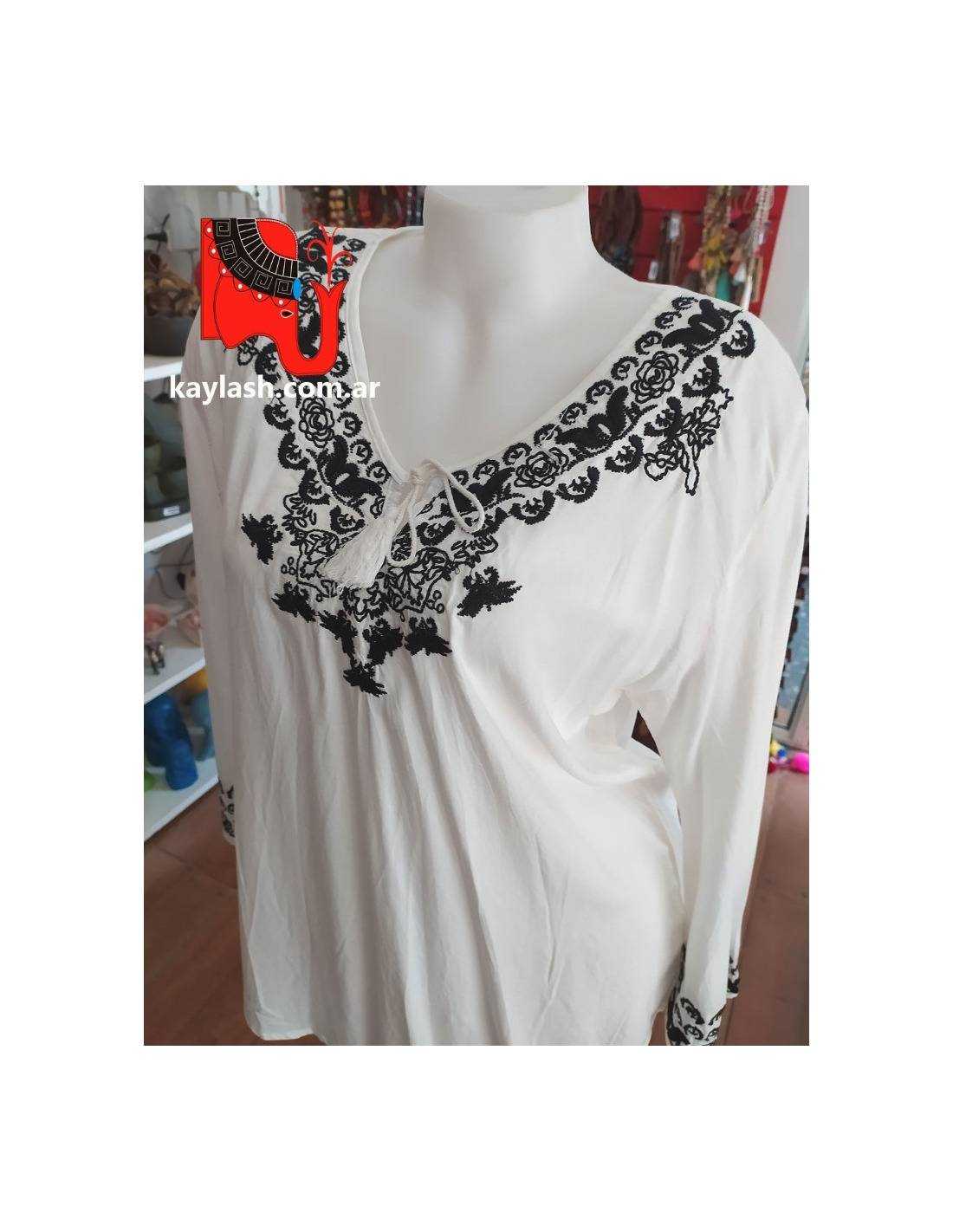 Blusa de inspiración india con delicados bordados artesanales que aportan color, textura y un toque bohemio único. Confeccionada en tela suave y ligera para brindar frescura y comodidad durante todo el día. Ideal para combinar con jeans, faldas o pantalones anchos y crear un look original y sofisticado.