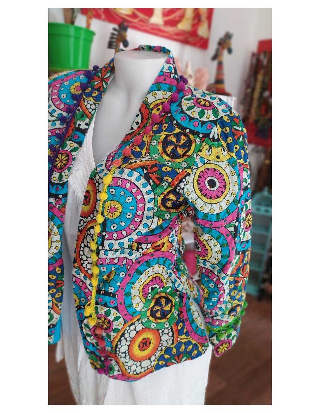 Lo que realmente hace destacar a la Chaqueta Bombai Mandala sobre los abrigos industriales masivos es la profundidad de su propuesta visual. El mandala, presente rítmicamente en el diseño de la espalda o los laterales, representa la totalidad y la armonía del universo. En este 2026, la tendencia de "moda espiritual" nos impulsa a elegir prendas que resuenen con nuestro interior; por eso, esta chaqueta combina rítmicamente colores vibrantes y formas geométricas que capturan la luz y las miradas. Es una pieza que invita a la contemplación y que comunica rítmicamente una personalidad creativa, segura y profundamente vinculada a las tradiciones de la India.