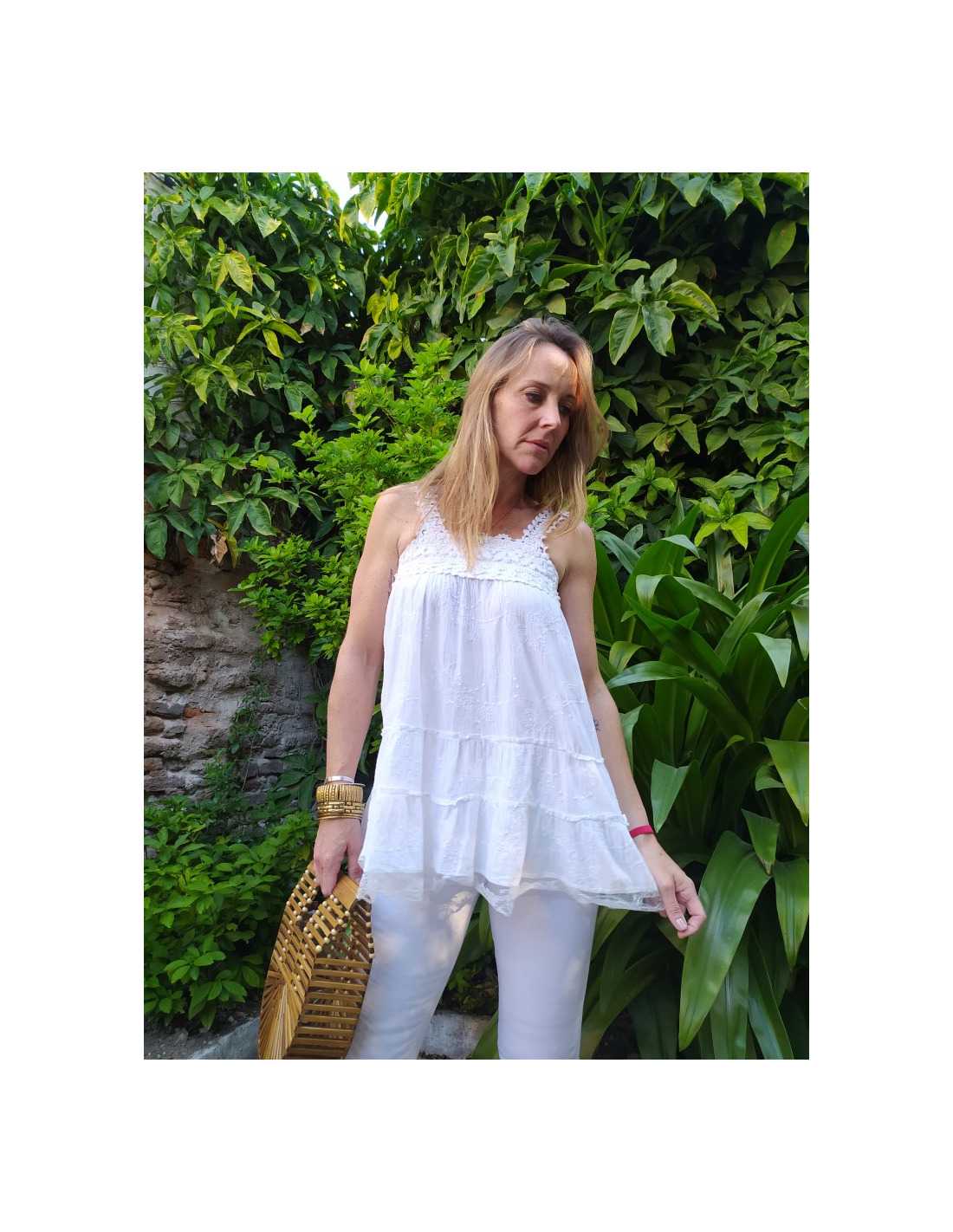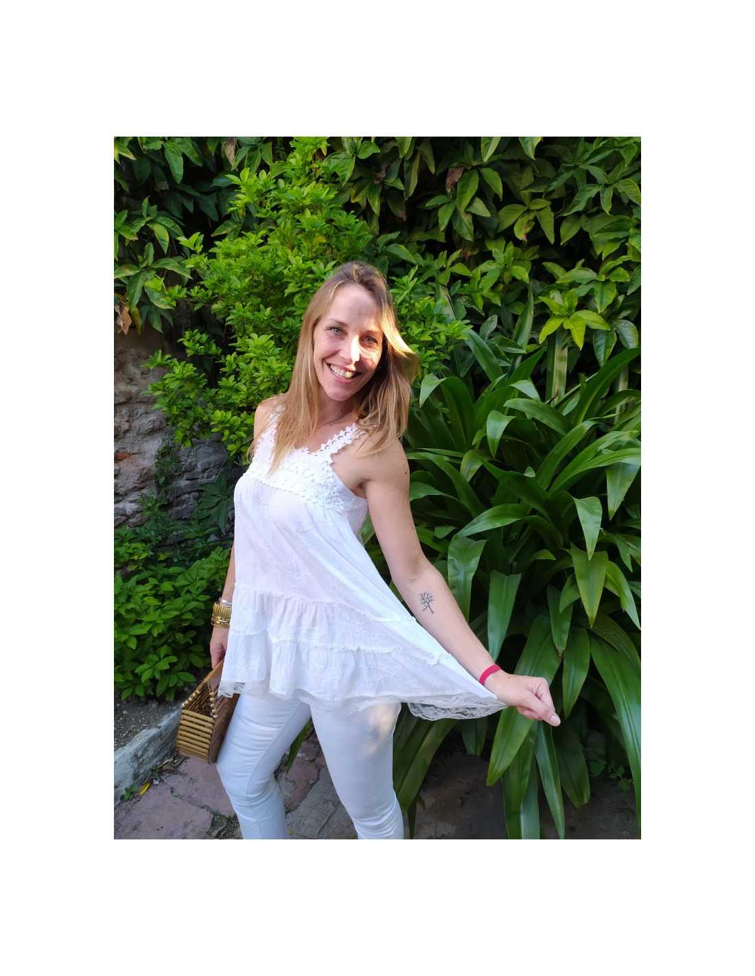 En nuestra tienda online, la nobleza de los materiales es una prioridad absoluta para garantizar que tu experiencia sea excepcional. La Musculosa con Encaje está fabricada con fibras seleccionadas por su suavidad al contacto con la piel y su gran capacidad de transpiración, algo fundamental para mantener la calma en los días calurosos.