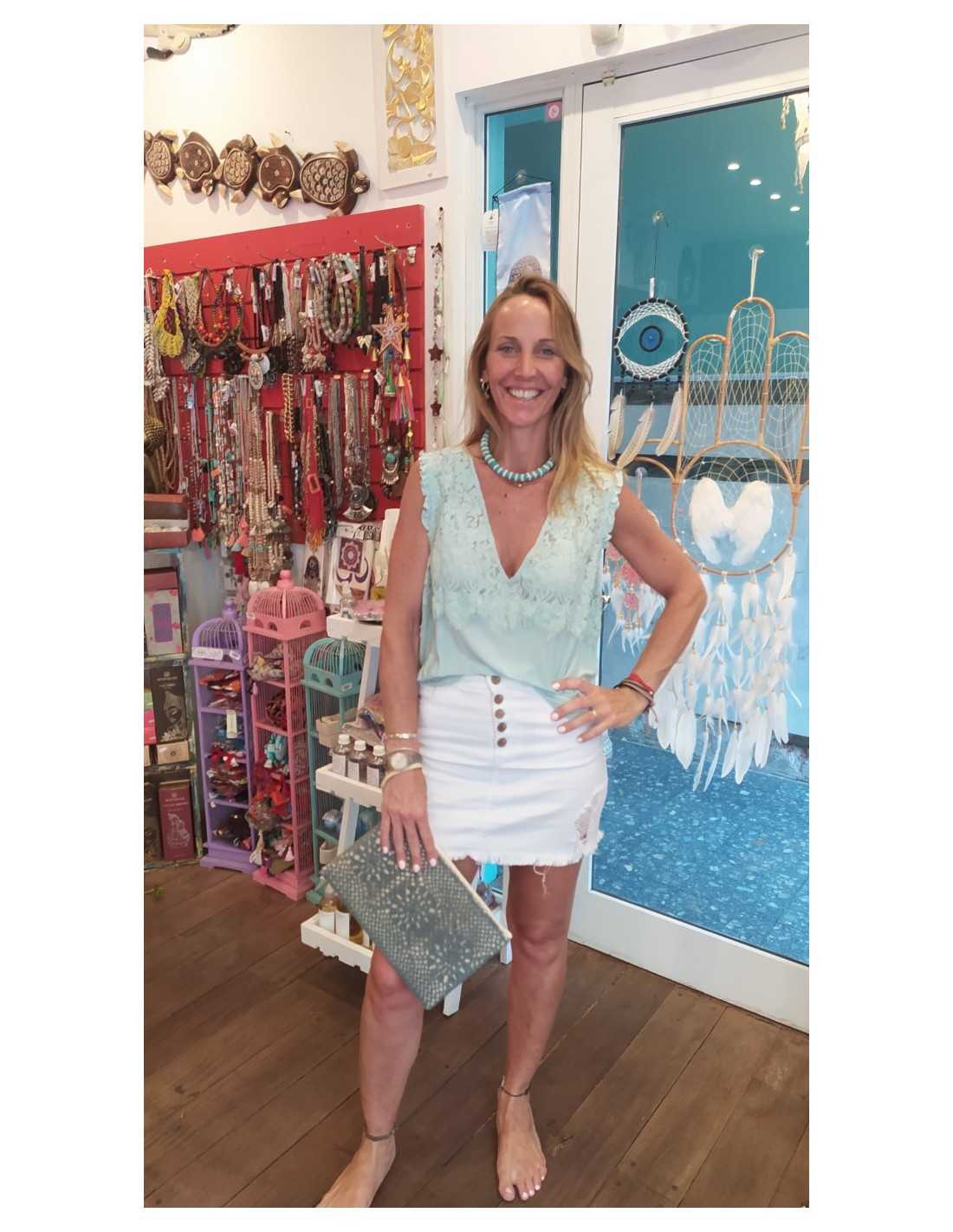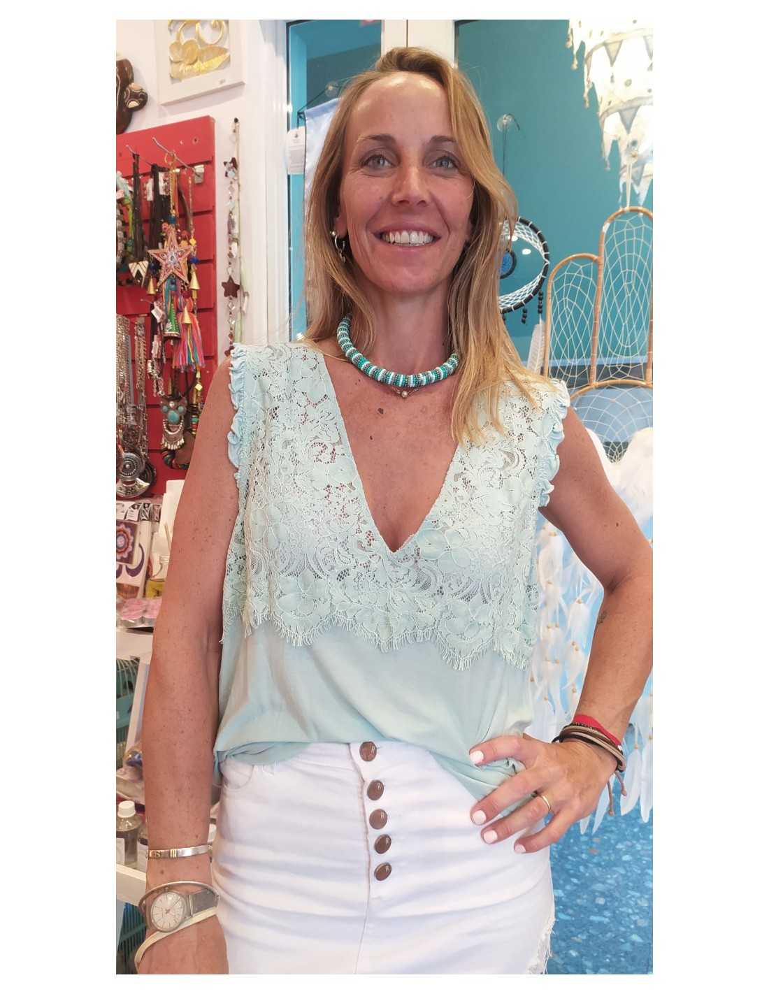 Si buscás un aire más distendido, esta musculosa funciona de maravilla con unos jeans clásicos o una falda de lino. Al ser una prenda con tanto detalle visual, no necesitás recargarla con muchos accesorios; unos aros simples y alguna de nuestras piedras naturales de Kaylash serán suficientes para completar un estilo bohemio y chic. Es la opción ideal para eventos de tarde, paseos de fin de semana o esas salidas donde querés lucir impecable sin esfuerzo.