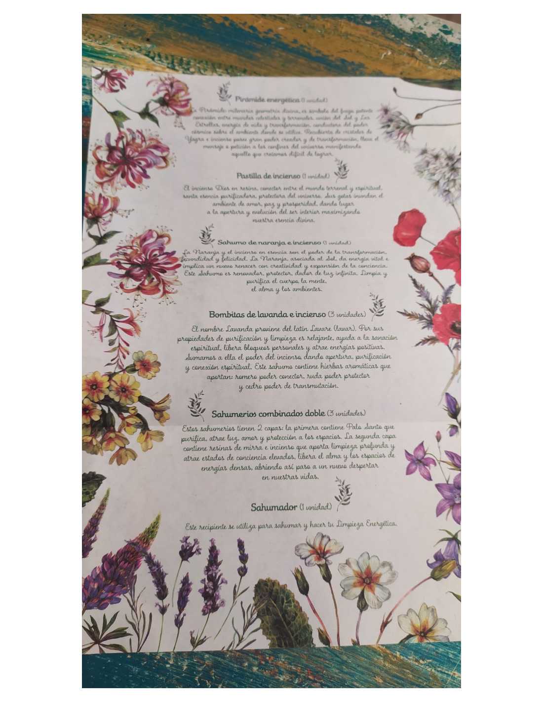 Incluye pirámide energética, pastilla de incienso, Sahumo de naranja e incienso, bombitas de lavanda, sahumerios de palo santo con mirra e incienso, y sahumador.